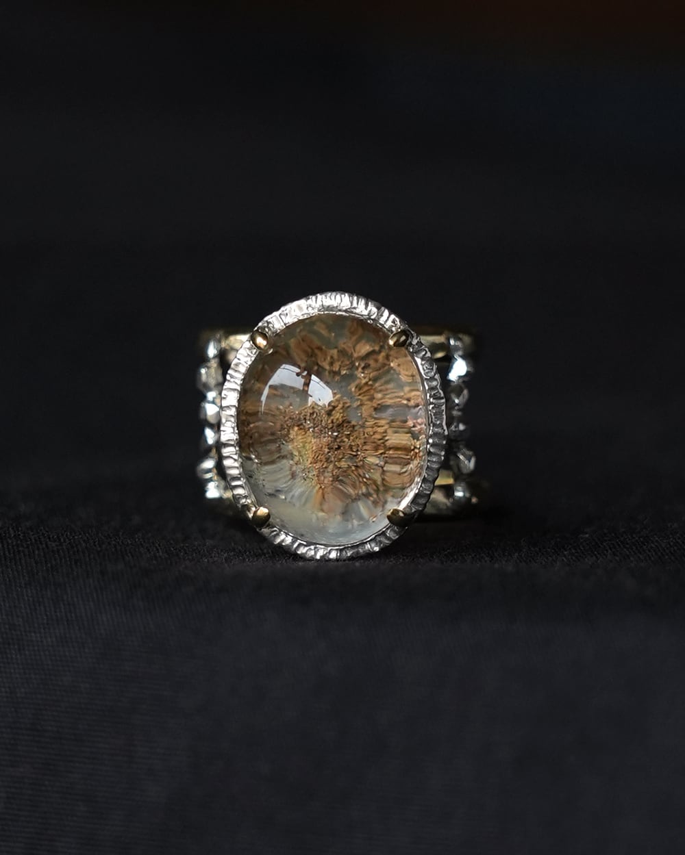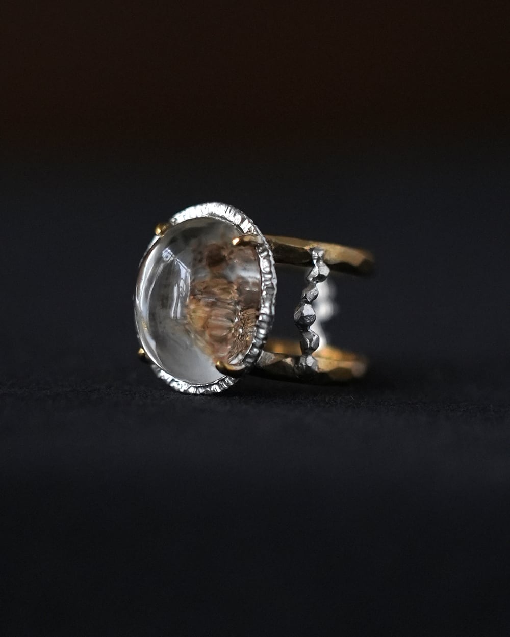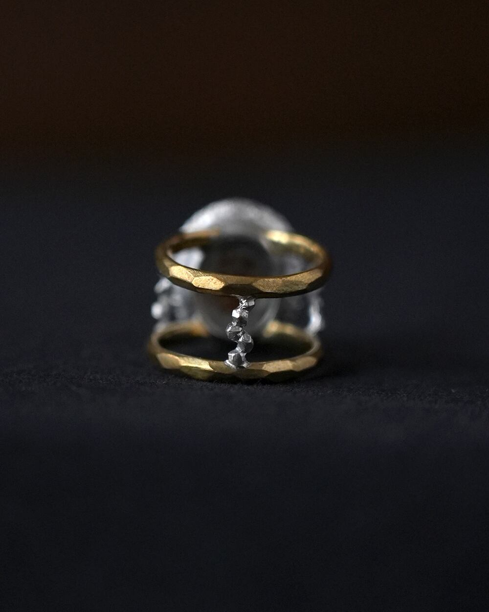 荒いヤスリで面取りした真鍮の2本のアーム。シルバーの石座、爪は真鍮です。