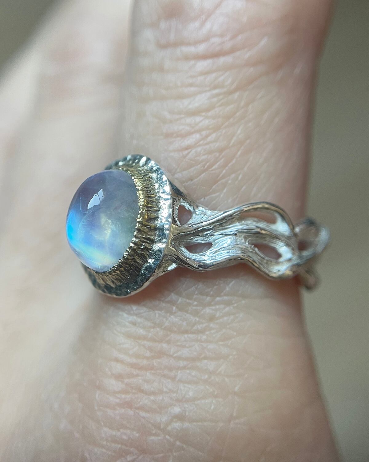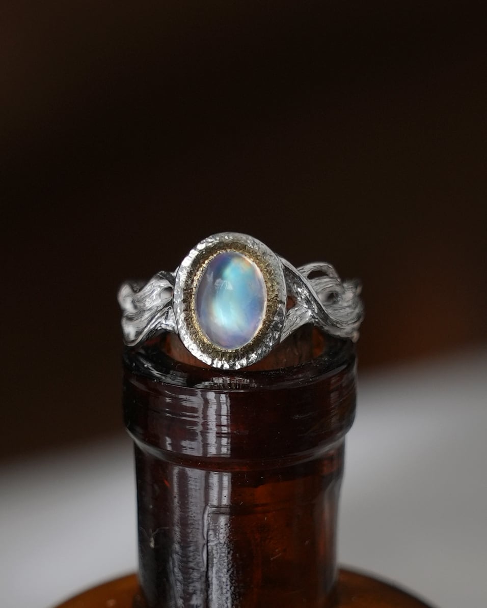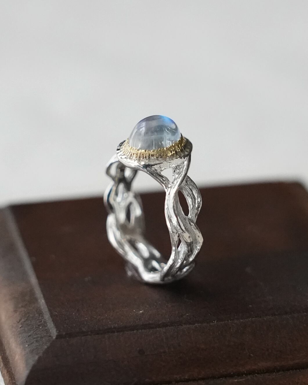 ルースの周りは真鍮で囲い、しなやかで美しく波打つ髪をモチーフにしたシルバーのアームと合わせました。