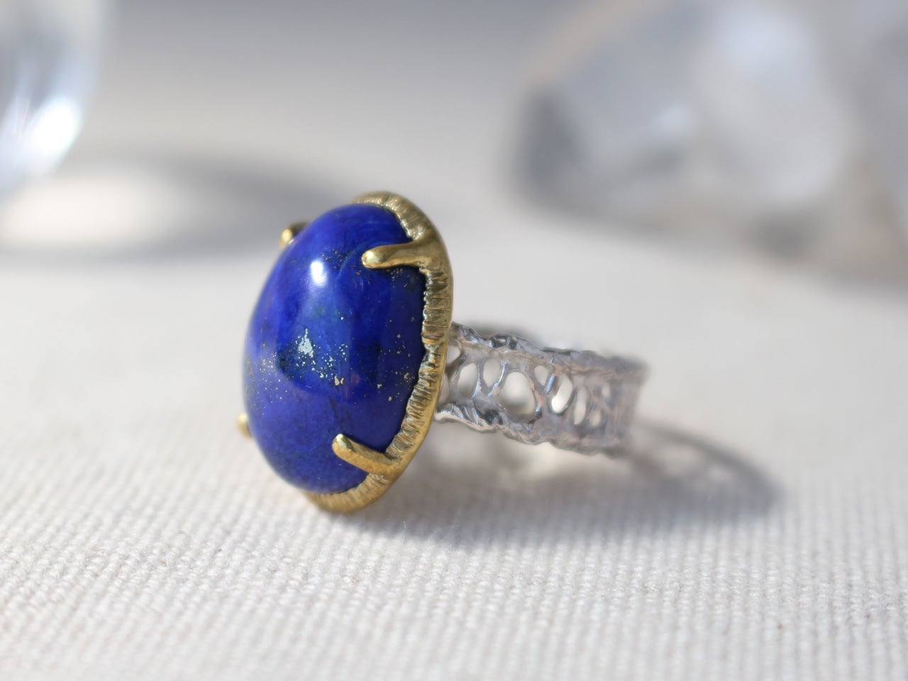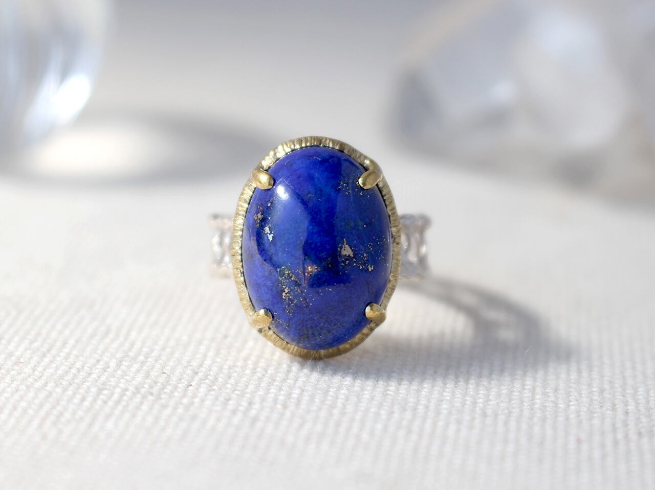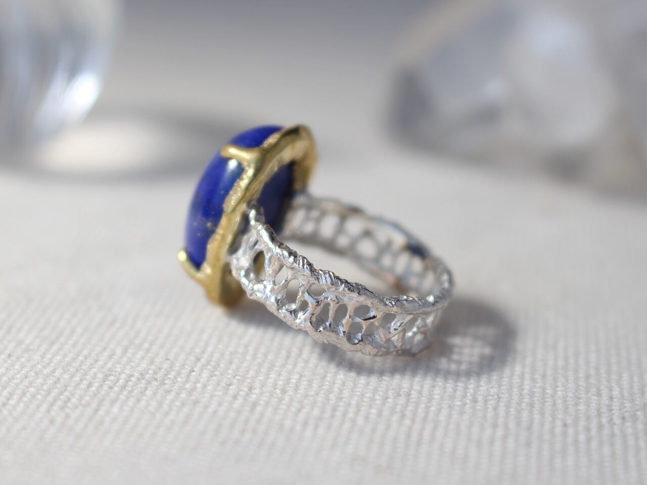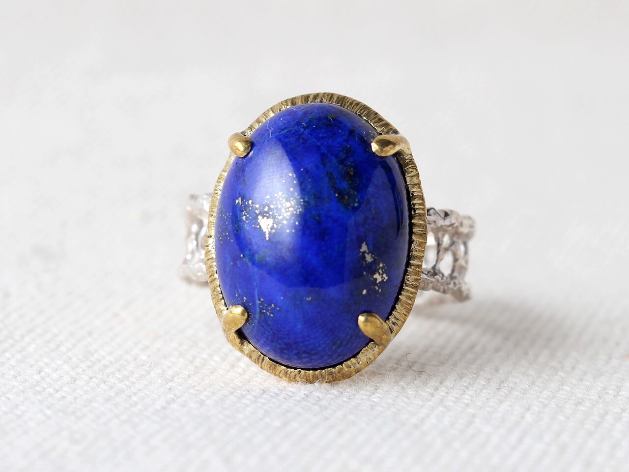 アームは幅がありながら透かしの加工を施してあるので軽やかに、ラピスラズリのボリュームが引き立ちます。