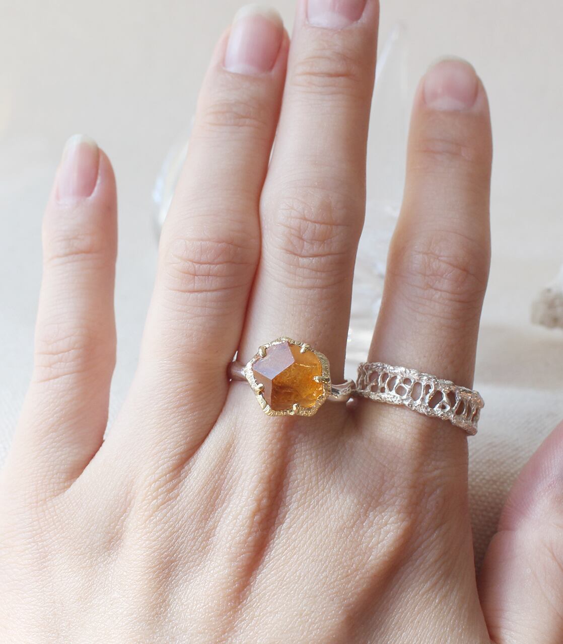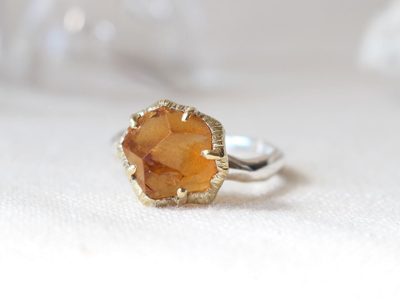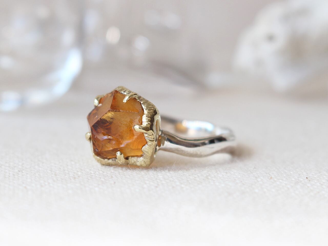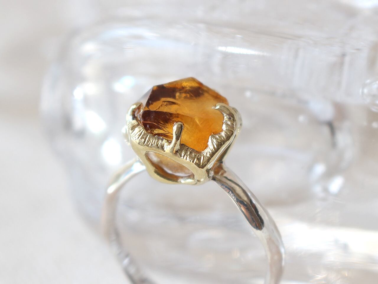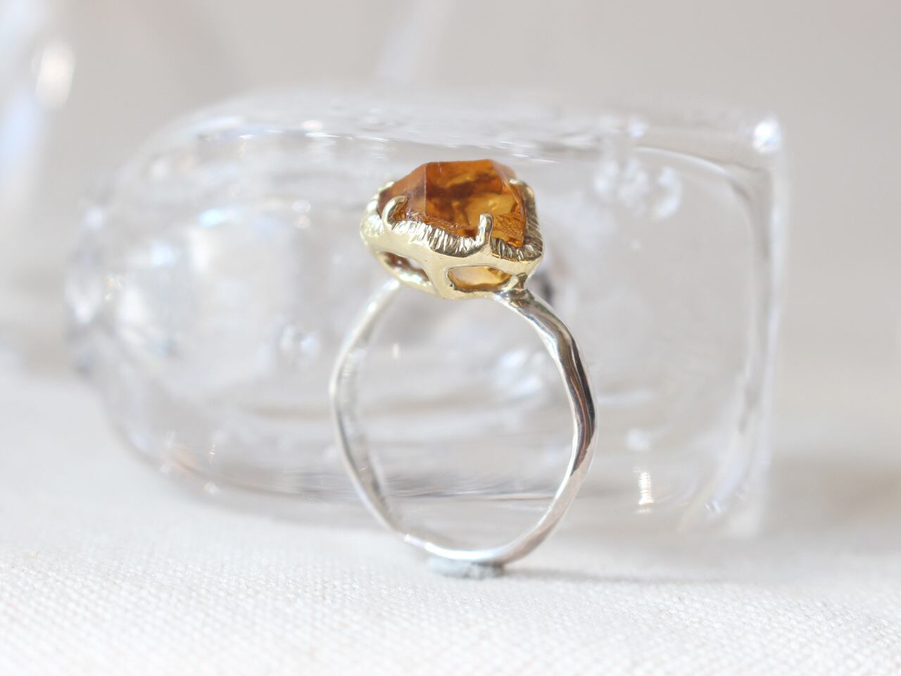 ジューシーな色合いのシトリンを大きい透かしの入った真鍮の石座で包み込んだリング。