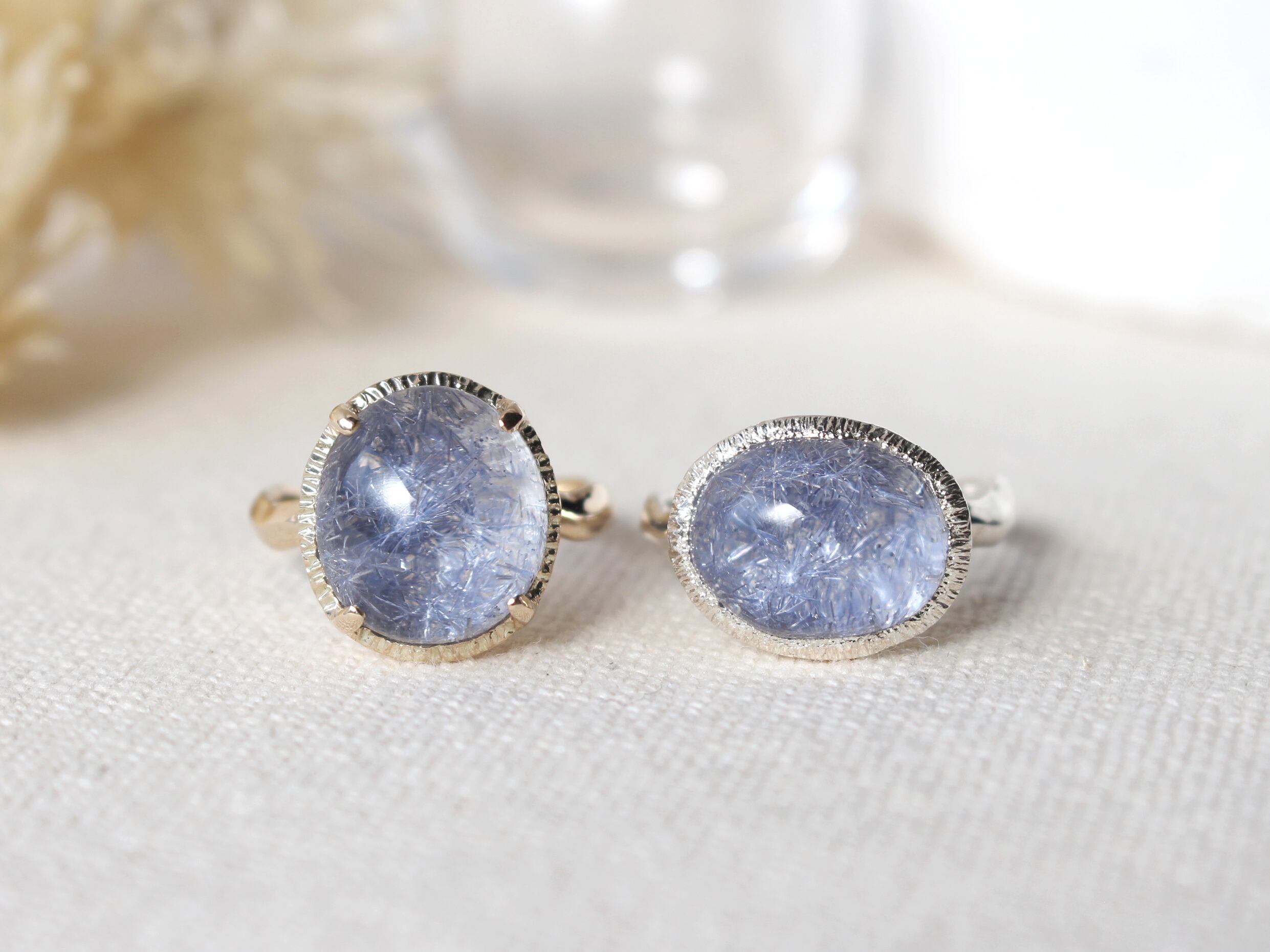 抑揚をつけた波打つ鏡面仕上げのアームに淡いブルーの花を咲かせたデュモルチェライトインクォーツを留めたリング。