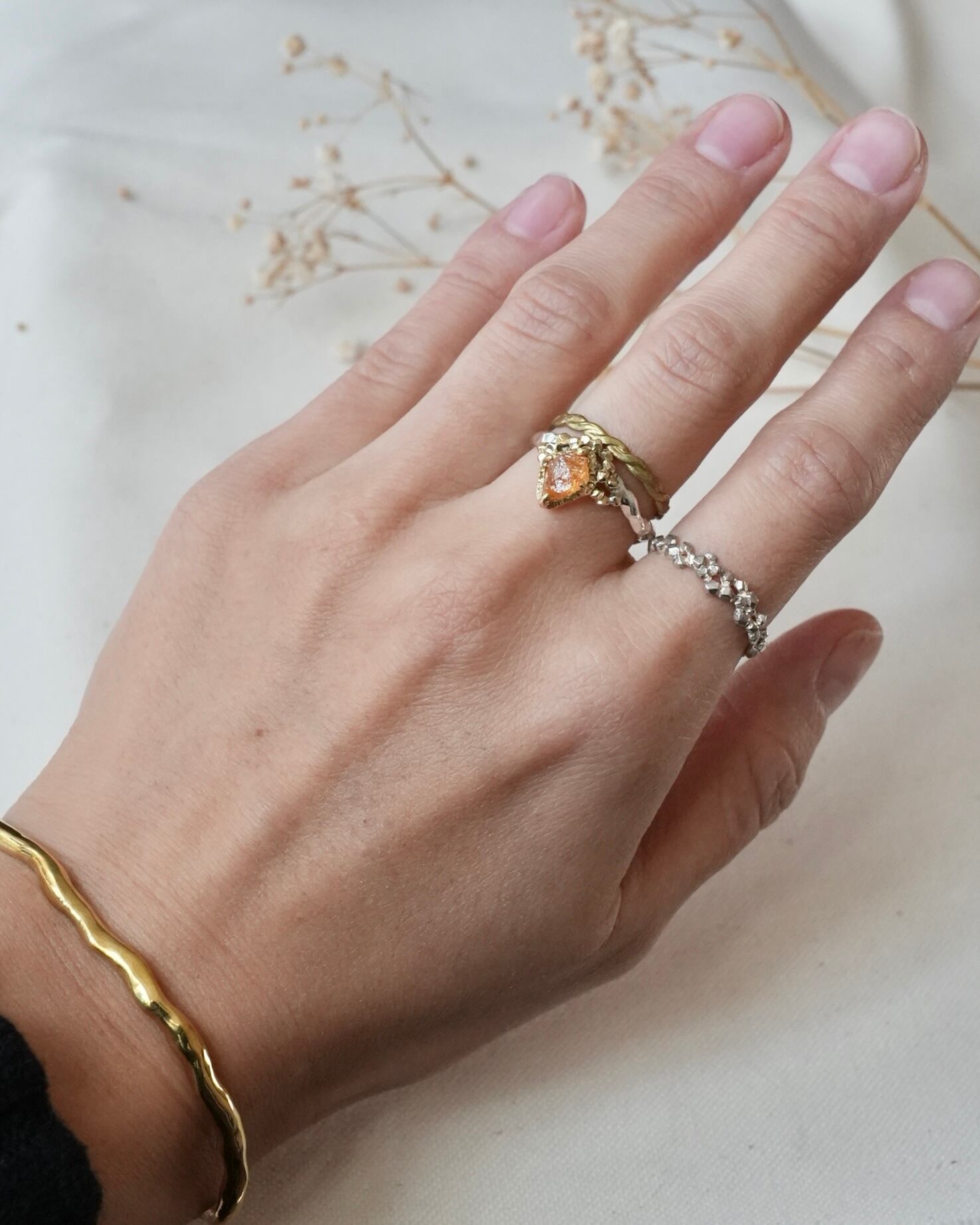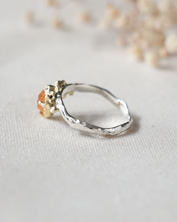 結晶のままの美しさを残した鮮やかなオレンジ色のガーネットを真鍮の石座で包み込みました。